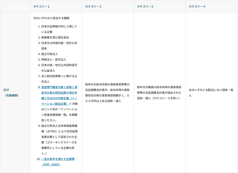 「所属機関」の規模等によって、カテゴリ1~4の「4段階」にランク付けを行っており、最も信頼度が高く、提出書類が少ない企業(所属機関)を「カテゴリ1」、反対に、最も信頼度が低く、慎重な審査が求められる企業(所属機関)を「カテゴリ4」とされています。具体的な分類方法は下記の画像の通りです(※たまに変更が生じますのでご留意ください)。