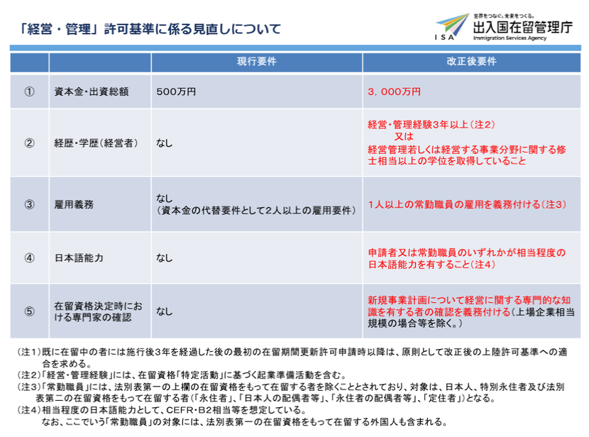1.<新基準>在留資格「経営・管理」の活動内容及び許可要件の概要について